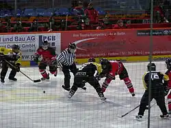 September 28, 2003 marked an important day in the history of the club, as it was the day on which the rebuilding of the Herlev Skøjtehal was completed. Unfortunately the Eagles were unable to mark the occasion with a win, suffering a 4–0 loss to Herning Blue Fox.[5] The club's fortunes didn't improve during the 2003-04 season however, finishing 8th out of 9 teams.[20] However, the following season would see an upturn in the team's fortunes, as they achieved their highest placing in nearly 20 years by finishing 3rd.[16][21] Despite the good run of form in the regular season, they had a disappointing play-offs, losing in the opening round to the Odense Bulldogs. Following the end of the season, the team again changed its name, this time to the Herlev Hornets.[16] Moving forward, the team were regularly found at the foot the league table, finishing last for 3 years in a row, whilst selling off their most valuable players to ensure solvency.[16][5] The 2007–08 AL-Bank Ligaen season was an abject once, which saw the Hornets led by coach Johan Marklund win only 4 games all season, failing to win a single game from November onwards.[5][22] Despite the team languishing at the foot to the AL-Bank Ligaen the team nevertheless remained in the Danish top flight. The 2008–09 season again saw the team at the foot of the table, with Coach Marklund being relieved of his duties and replaced with Erik Vikström. Things only got worse for the team however, as the mounting financial issues caught up with the team, though they were able to make it to season end.[5]