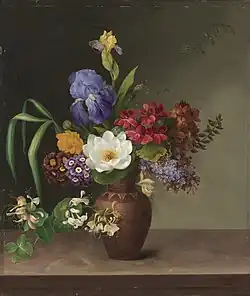 From 1821 and for the rest of her life, Neergaard was a frequent exhibitor at the Charlottenborg Spring Exhibitions. Her first submission was a vase of flowers, copied from one of Camradt's works. It was in gouache, a technique used by the older flower painters at the time. She subsequently worked with oils, depicting flowers in vases, bowls or baskets. In later life, she included wild flowers and outdoor plants. Inspired by Bertel Thorvaldsen, in 1831 she began to paint flowers in Etruscan vases. Similar motifs can be seen in the colourful works painted a few years later by her contemporary Johan Laurentz Jensen.[1]