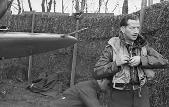 He accumulated further victories against the RAF and on account of his 40th victory achieved on 21 April 1941 was honorably mentioned in the Wehrmachtbericht propaganda radio report, the first of three such mentions, on 22 April.[12] The next day, he was the 11th officer or soldier of the Wehrmacht honored with the Knight's Cross of the Iron Cross with Oak Leaves (Ritterkreuz des Eisernen Kreuzes mit Eichenlaub) which was presented to him by Adolf Hitler.[3][10] He claimed his last two aerial victories on the Western Front on 8 May. The claims were over Hawker Hurricane Mk IIs from No. 302 Polish Fighter Squadron piloted by Piotr Łaguna and Marian Domagała, both pilots bailed out.[13]
