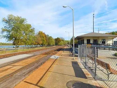 A rebuilt station was approved for construction in 2006 and opened on September 12, 2014.[4] The one story depot features a random rubble stone veneer base, walls clad in traditional clapboard siding and a hipped roof. The waiting room is trimmed in bead board wainscoting, and there are also accessible restrooms. Displays trace the area's transportation history, with a focus on the Missouri River, railroads and roadways. Funding for the project came through the Federal Highway Administration's Transportation Enhancements program, the city of Hermann and the Dierberg Educational Foundation, a local non-profit organization that supports projects to preserve the region's cultural heritage.[5]