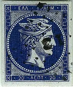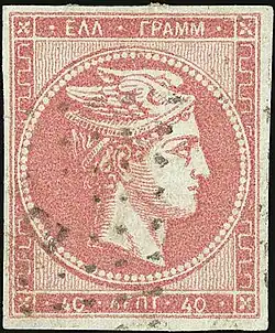 The first type of the Greek stamp is named "large Hermes head" in order to differentiate it from the following one, issued in 1886, and named "small Hermes head".[13]