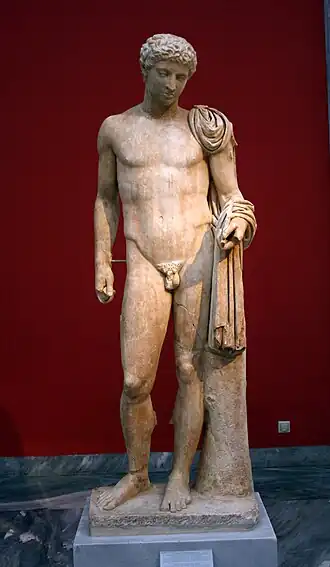 Hermes of Aegium was produced during the Roman period, around the Augustan Age (late first century BC and early first century AD, when Augustus was emperor),[1] and was most likely used as a funerary sculpture.[2] It was found in Aigion (ancient Aegium) in Achaea (Peloponnese, in southern Greece) after which it took its name, in 1860.[2][3] It was purchased by the archaeological society for 12,000 drachmas.[4]