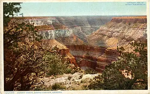 Hermit Canyon is a north-trending canyon in western Grand Canyon, about 6.0 miles in length, below the South Rim. It is named for the hermit who built Hermit Camp, at the Colorado River, Louis D. Boucher.[3] Hermit Canyon's east flank is bordered by Pima Point of the South Rim (about at the canyon midpoint), and Pima Point is ~2.0 from the Hermit Canyon midline. Pima Point is about 3.5 miles west-northwest of Grand Canyon Village, and the South Rim at Pima Point trends southward, as the start of Western Grand Canyon; it also marks the terminus of the West Rim Road.