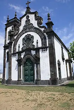 Located in an isolated urban context, implanted on an elevated hilltop over the historic Fort of Mãe de Deus, with plastered walls, relatively close to the University of the Azores.[1] The church's frontal access is marked by a basalt staircase of two flights, flanked by rectangular plinths, plastered and painted in white, caped by faceted pillars and two orders of plinths.[1] The courtyard is covered in sod, and dotted by trees.[1]