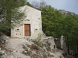 The hermitage is located along the mule track connecting Campo di Giove with Palena, passing through the Guado di Coccia pass.[2] It serves as an example of a church-mountain hut-shepherd's hut.[1] There is limited historical information on the hermitage,[3] but it is believed to have been commissioned by the future Pope Celestine V in the 13th century.[2] The only certain date is that inscribed on the architrave of the 1748 restoration, likely after damage from the 1706 Abruzzo earthquake.[1] More recent accounts link the path to the escape of prisoners from the internment camp of Sulmona, heading to the pass to cross the Gustav Line.[4] Related to these events, a memorial dedicated to Ettore De Corti, who was killed by the Germans while attempting to cross the front line, stands at the pass.[4] In 2009, the church underwent restoration work carried out by the management body of the Maiella National Park.[1]
