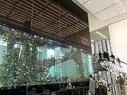 110 Bishopsgate was designed to feature a concierge-style entrance and reception area, incorporating a 70,000-litre (15,000 imp gal; 18,000 US gal) aquarium containing around 1,200 fish.[10] The aquarium is the largest privately owned example in the United Kingdom and contains over 60 species of fish in an entirely sustainable ecosystem; the species were selected by expert biologists and animal curators to ensure compatibility and adaptability to the environment. The tank is attended to by a team of two full-time fish attendants, who feed the fish a diet rich in natural ingredients according to their requirements and monitor the tank for water chemistry and fish health, and two to three part-time divers who clean the rockwork and glass regularly.