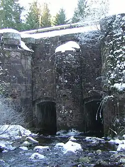 Until 1844 a wooden splash dam (Schwallung) stood on the same spot. Because it took a great deal of maintenance, however, it was replaced under the direction of Weisenbach master stonemason, Belzer, with a dam made of bunter sandstone that is still there today. The individual stones were very precisely carved and laid without any mortar and the structure was finished with perfectly fitting, wedged keystones.