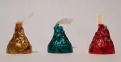 ![]() Hershey's Kisses in foil wrappers. The paper strip coming out the top identifies each flavor. | |
