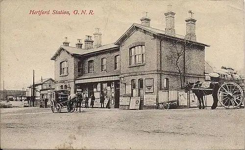 The station was opened on 1 March 1858, originally being named Hertford Cowbridge.[1] It was situated on the branch from Hatfield, between Hertingfordbury and a junction with the Great Eastern Railway just to the east of their Hertford station.[2]