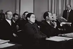 The hostility between Begin and Israel's first Prime Minister, the Mapai leader David Ben-Gurion, which had begun over the Altalena Affair, was evident in the Knesset. Ben-Gurion coined the phrase "without Herut and Maki" (Maki was the Communist Party of Israel), a reference to his position that he would include any party in his coalition, except those two.[9] In fact, Herut was approached at least three times (1952, 1955, and 1961) by Mapai for government negotiations; Begin turned down each offer, suspecting that they were designed to divide his party.[10] The ostracism also expressed itself in the Prime Minister's refusal to refer to Begin by name from the Knesset Podium, using instead the phrase "the person who sits next to M. K. Badar", and boycotting his Knesset speeches.[8][11]