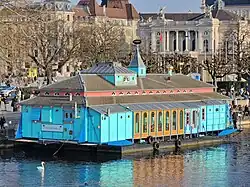 Namely in the winter season, the theater is anchoring in the Zürichsee lake shore cities of Rapperswil (April), Stäfa, Thalwil and Zürich (January to March) at Bellevueplatz at the Utoquai. The cabaret-oriented program schedule is combined with diners on board.[2]