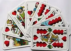 Herzeln is a compendium card game for three or four players in a partie of eight deals (Touren, cf. Quodlibet). As its name suggests, it is an Austrian game.[1] It should not be confused with other games sometimes called Herzeln, including Barbu and Kein Stich.