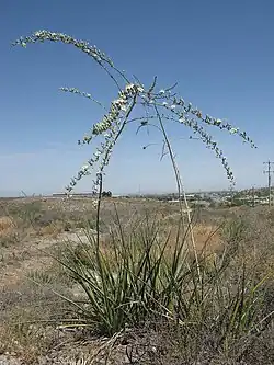 Hesperaloe funifera grows on rocky slopes and open plains in the Tamaulipan mezquital and the eastern edges of the Chihuahuan Desert. It is a rosette-forming perennial. It has long, narrow, yellow-green blades up to 200 cm long but only 5 cm across. Flowering stalk can be up to 250 cm tall, with long branches. Flowers are green or white, often tinged with purple, about 25 mm across.[5][9][10] The specific name funifera is derived from the Latin funis "rope" and fero "I bear" and thus signifies "bearer (provider) of rope" in reference to the plant's strong fibre, which may be used for this purpose.[11][12]