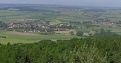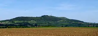 Hesselberg (pronounced [ˈhɛsl̩ˌbɛʁk] ⓘ; 689 m above sea level) is the highest point in Middle Franconia and the Franconian Jura and is situated 60 km south west of Nuremberg, Germany. The mountain stands isolated and far from the center of the Franconian Jura, in its southwestern border region, 4 km to the north west of Wassertrüdingen. The mountain's first recorded name was Öselberg, which probably derived from öder Berg (bleak mountain). This name later changed to Eselsberg and finally to the current name Hesselberg. As a butte the mountain provides an insight into Jurassic geology. It has also witnessed an eventful history, many incidents were handed down from generation to generation and these mixed with facts have become legends. Nowadays many people visit Hesselberg in order to enjoy nature and the wonderful vista. When the weather is clear the Alps 150 km away can be seen.