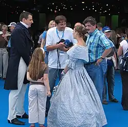 Hessentag has undergone many changes.[2] Originally it was held on one weekend (three days), but grew to a week, including both weekends. It connects Hessian culture, tradition and modern lifestyle. The first focus of the event was presentation of traditions, especially the wide variety of costumes in Hesse and also the costumes of the new citizens who came after 1945. Concerts by international pop groups have become a featured part of the program. The Landesausstellung (State Exhibition) is shown in mobile halls, presenting the state government, the parliament, parliamentary groups, various state agencies and organizations, associations and clubs. Regions of Hesse are presented mostly from a tourist's point of view. Since 1971, for each Hessentag a couple (Hessentagspaar) is elected to represent it. Since 1993, a motto for the event was chosen by the hosting town, also a logo. The event is traditionally closed by a parade.[3]