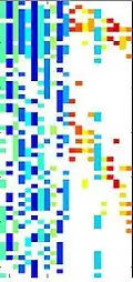 As an example, the figure on the left shows the sparsity pattern of the Hessian matrix where the columns have been appropriately coloured in such a way to allow columns of the same colour to be merged without incurring in a collision between elements.