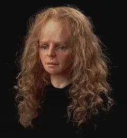 The Yde Girl was put on display and further study was not carried out on the remains until 1992. Richard Neave, of the University of Manchester, took a CT scan of the skull of Yde Girl and determined her age, both anatomically and historically.[3][4][6] The Yde Girl became internationally known when Neave made a reconstruction of her head, using techniques from plastic surgery and criminal pathology.[7] Due to the state of the body, the work on the reconstruction included some guesswork, for example, the nose and some other facial features.[2] Yde Girl and her modern reconstruction are displayed at the Drents Museum in Assen.