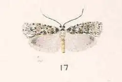 ♀︎. 9". Head white. Palpi about twice the length of head, upper half white, lower half dark fuscous, terminal joint white, dark fuscous at base. Antennae white, with indications of dark rings. Thorax white, on shoulders ochreous-tinged. Abdomen ochreous-white. Anterior and middle legs dark fuscous, with ochreous-white rings at apex of joints; posterior legs ochreous-white. Forewings elongate-oblong, narrow, costa slightly arched, bent and roughened with scales about one-third, apex obtusely pointed, hindmargin straight, moderately oblique; white, with a few scattered grey scales, towards inner margin very faintly ochreous-tinged; a thick black streak along basal fifth of costa, attenuated at each end; a black dot on costa closely beyond it; a small irregular black mark in disc at one-third, immediately preceded by a small dark fuscous-grey suffusion, and followed by two tufts of raised scales, half blackish and half white; a small subquadrate rather inwardly oblique black spot on costa at one-third, almost connected with discal black spot; all these black markings are somewhat mixed on margins with ochreous; some raised scales towards base, and inner margin at one-third; five short cloudy blackish marks on costa at equal distances between one-third and apex, rather oblique inwardly; five small spots of raised whitish-ochreous scales arranged in an oval in disc, each with a few black scales on margin; between these, and above posterior of them, is an ill-defined grey suffusion; a very ill-defined cloudy grey irregular dentate transverse line from second of the five costal marks to inner margin at four-fifths, only distinct on upper half and on inner margin; a more distinct dentate grey line from third costal mark to inner margin before anal angle, strongly curved outwards and sinuate, containing a series of ill-defined black dots; a row of very ill-defined black dots on hindmargin : cilia grey, closely irrorated with whitish points. Hindwings whitish- slaty-grey, cilia white, with a faint grey line.[3]