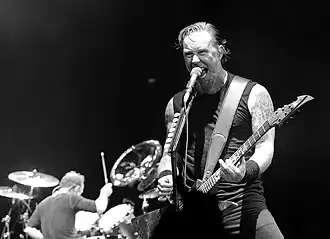 James Alan Hetfield (born August 3, 1963) is an American musician. He is the lead vocalist, rhythm guitarist, co-founder, and a primary songwriter of heavy metal band Metallica. He is mainly known for his raspy voice and intricate rhythm playing, but occasionally performs lead guitar duties and solos both live and in studio. Hetfield co-founded Metallica in October 1981 after answering an advertisement by drummer Lars Ulrich in the Los Angeles newspaper The Recycler. Metallica has won ten Grammy Awards[1] and released 11 studio albums, three live albums, four extended plays, and 24 singles. Hetfield is often regarded as one of the greatest heavy metal rhythm guitar players of all time.[2]