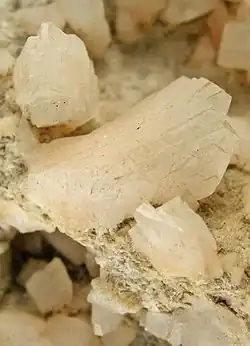 Heulandite occurs with stilbite and other zeolites in the amygdaloidal cavities of basaltic volcanic rocks, and occasionally in gneiss and hydrothermal veins.[8] It forms at temperatures below about 100 °C (212 °F), and so its presence in sedimentary rocks indicates that these have experienced shallow diagenesis.[9]