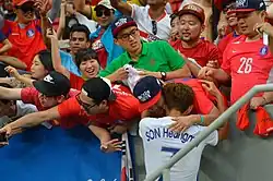 On 13 June 2017, Son broke his right forearm after falling awkwardly on his arm during a World Cup qualifier match in Doha against Qatar.[175] He was part of the team that saw Korea qualify for the 2018 World Cup after a 0–0 draw against Uzbekistan on 5 September 2017.[176] On 4 June 2018, Son was selected in 23-man squad for the World Cup.[177] On 23 June, Son scored a goal from outside the penalty area – a curling strike into the top corner – though his side was defeated with a 2–1 loss to Mexico in their second group stage match of the World Cup.[178] On 27 June, during their final group stage match, he scored the second goal in the 97th minute in their 2–0 victory over world champions Germany, sealing their elimination.[179]