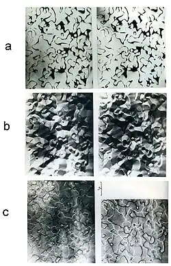 Electron microscopy studies demonstrated that thermal antiphase boundaries (APBs) form during cooling through the ordering temperatures, as ordered domains nucleate at different centers within the crystal lattice and are often out of step with each other where they meet.[21][25] The anti-phase domains grow as the alloy is annealed. There are two types of APBs corresponding to the B2 and L21 types of ordering. APBs also form between dislocations if the alloy is deformed. At the APB the manganese atoms will be closer than in the bulk of the alloy and, for non-stoichiometric alloys with an excess of copper (e.g. Cu2.2MnAl0.8), an antiferromagnetic layer forms on every thermal APB.[32] These antiferromagnetic layers completely supersede the normal magnetic domain structure and stay with the APBs if they are grown by annealing the alloy. This significantly modifies the magnetic properties of the non-stoichiometric alloy relative to the stoichiometric alloy which has a normal domain structure. Presumably this phenomenon is related to the fact that pure manganese is an antiferromagnet although it is not clear why the effect is not observed in the stoichiometric alloy. Similar effects occur at APBs in the ferromagnetic alloy MnAl at its stoichiometric composition.