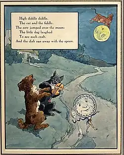 "Hey Diddle Diddle" (also "Hi Diddle Diddle", "The Cat and the Fiddle", or "The Cow Jumped over the Moon") is an English nursery rhyme. It has a Roud Folk Song Index number of 19478.[1]