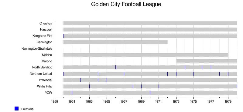 | Panton Hill Football League[6] | 1931 | 1987 | Donnybrook, Hurstbridge, Kinglake, Lalor, Latrobe University, Mernda, Panton Hill, Research, St Andrews, Watsonia, Whittlesea | ||