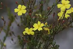 Hibbertia andrewsiana is a species of flowering plant in the family Dilleniaceae and is endemic to the south-west of Western Australia. It is a shrub with an erect or spreading habit and typically grows to a height of 15–60 cm (5.9–23.6 in). It blooms between September and January and produces yellow flowers.[2]