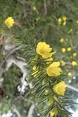 Hibbertia hamulosa is a spreading shrub that typically grows to a height of up to 1 m (3 ft 3 in) and has branchlets densely covered with woolly, grey or white hairs when young. The leaves are crowded, linear to awl-shaped, almost needle-shaped, 7–18 mm (0.28–0.71 in) long and 0.5–1.0 mm (0.020–0.039 in) wide on a petiole 0.5–1.0 mm (0.020–0.039 in) long. The flowers are arranged singly on the ends of short side shoots, on a densely hairy peduncle 2–4 mm (0.079–0.157 in) long with awl-shaped bracts at the base of the sepals. The five sepals are joined at the base, 5–6.5 mm (0.20–0.26 in) long, the inner ones slightly broader than the outer ones. The five petals are golden yellow, egg-shaped with the narrower end towards the base and 4–7 mm (0.16–0.28 in) long with a notch at the tip. There are five to eight stamens, fused at the base on one side of the two densely hairy carpels that each contain two ovules. Flowering mostly occurs between July and October.[2][3]