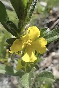 Hibbertia villosa is an erect shrub that typically grows to a height of up to 50 cm (20 in) and has its branches and leaves covered with whitish hairs up to 3 mm (0.12 in) long. The leaves are spatula-shaped to egg-shaped with the narrower end towards the base, 7–25 mm (0.28–0.98 in) long, 3–10 mm (0.12–0.39 in) wide and sessile. The flowers are arranged in leaf axils and are sessile with hairy bracts about 1.5 mm (0.059 in) long at the base. The sepals are narrow egg-shaped, 6.3–9 mm (0.25–0.35 in) long, the petals yellow, spatula-shaped, 10–23 mm (0.39–0.91 in) long and 7–10 mm (0.28–0.39 in) wide. There are usually fifteen to twenty stamens arranged in three groups around three glabrous carpels. Flowering occurs from August to November.[2][3]