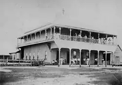 The earlier hotel, a substantial, 20 bedroom, two-storeyed timber building with double front verandahs and an observation tower, was erected in 1885 by Townsville contractors Hinton & Co., for publicans George Parker Hides and Duncan McColl, who also were in partnership in the Royal Hotel at Herberton. Their Cairns Hotel was located in Lake Street, adjacent to the site of the present Hides' Hotel, on land owned by Dr Edward Albert Koch, and let to Hides and McColl on a building lease. It was erected during the second wave of building activity in Cairns (the first being the 1876–77 establishment of the settlement), following Cairns's designation in 1885 as the destination of the Tablelands rail link to the interior goldfields, and its proclamation as a municipality (Borough of Cairns) in the same year. The hotel was renovated c. 1891, and by 1899 a substantial, two-storeyed timber wing had been constructed at the rear, and the accommodation had been extended to 32 bedrooms.[1]