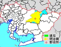 - On April 1, 2005 - The towns of Asuke, Asahi and Inabu, and the village of Shimoyama, along with the town of Fujioka, and the village of Obara (both from Nishikamo District), were all merged into the expanded city of Toyota. Therefore, Higashikamo District was dissolved as a result of this merger.