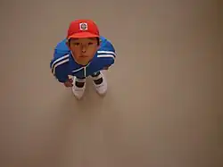 A high-angle shot is a cinematic technique where the camera looks down on the subject from a high angle and the point of focus often gets "swallowed up".[1]