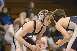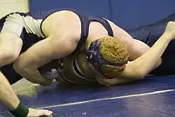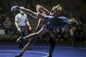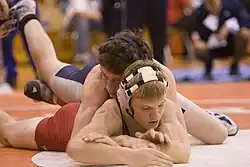 ![]() A wrestler attempts to finish a double leg takedown in a high school wrestling match | |