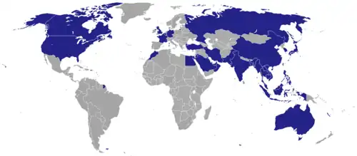 Prior to full independence in 1984, Brunei was a British protectorate, with international representation being the responsibility of the United Kingdom, in which its interests were represented by the "Brunei Government Agency" in London.[1] A Government Agency was also established in Kuala Lumpur, Malaysia, at the end of 1981.[2] This was later renamed the Brunei Commission.[3] When Brunei joined the Commonwealth on independence, these became known as High Commissions.[4] In 1983, shortly before independence, the country established a Government Agency in Manila, in the Philippines, which was later upgraded to an Embassy.[5]