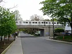 In 1915, Bloor Street was the site of a major public works at the north-west corner of High Park. The street, west of High Park Avenue, was crossed by creeks that emptied into Grenadier Pond. The creek banks were steep, making the roadway treacherous and difficult for traffic. A rail trestle was built to cross the gap at a level of 60 feet. The rails were used for rail cars to dump soil around the trestle. The trestle was completely buried and the present Bloor Street roadway built on top.[2] Existing north-south roadways connecting to Bloor Street were raised to meet the new level of Bloor Street and this facilitated the development of the neighbourhood. The first building in Canada designed by a Canadian trained female architect was constructed in the neighbourhood during this period. This landmark building by Jean Hall is a 1925 fourplex located at 63 Jerome Street.[3]