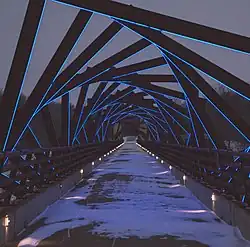 The 13-story-high (40-meter) and nearly half-mile-long (770-meter) trestle bridge provides scenic views of the Des Moines River Valley[12] and is located near mining shafts that were worked by Italian immigrant families and others who settled nearby.[13] The bridge decking incorporates a decorative structure that represents the view through a mine shaft,[13][14][15][16] and its design includes decorative lighting that remains on from dusk until midnight in the summer and until 9:00 pm in the winter.[5][6][17]