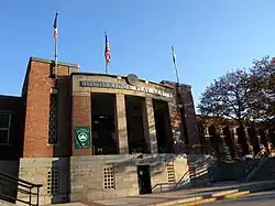 The bathhouse is set on an ashlar base above the surrounding street level, while the rest of the structure is made of brick. The building is rectangular: the longer side is on a north-south axis (i.e. parallel to Amsterdam Avenue), while the shorter side is on a west-east axis (i.e. parallel to 173rd Street). Its main entrance is on an elevated, slightly projecting portico at Amsterdam Avenue and 173rd Street. Stone staircases on either side ascend to the portico. The portico itself consists of two brick towers with flagpoles, two concrete piers that carry a concrete architrave, and a bronze sign with the words highbridge play center at the top of the architrave.[35] Just inside the portico, there is a circular turret with a second-story loft, overlooking the first-floor entrance.[35]