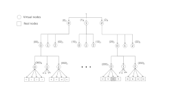 For example, instead of applying HRW to all 108 real nodes in the diagram, we can first apply HRW to the 27 lowest-tier virtual nodes, selecting one. We then apply HRW to the four real nodes in its cluster, and choose the winning site. We only need hashes, rather than 108. If we apply this method starting one level higher in the hierarchy, we would need hashes to get to the winning site. The figure shows how, if we proceed starting from the root of the skeleton, we may successively choose the virtual nodes , , and , and finally end up with site 74.