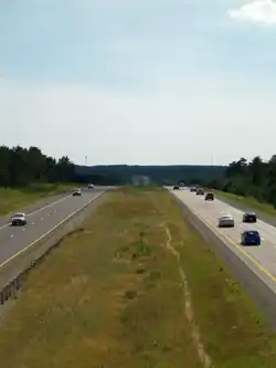 Highway 115 begins at a trumpet interchange with Highway 401, and is concurrent with Highway 35 for 18.9 km (11.7 mi) to Enterprise Hill.[3][4][5] For the length of this concurrency, it is a divided four lane RIRO expressway. Here, Highway 35/115 meets the eastern terminus of Highway 407 at a modified trumpet interchange in Clarington, and at Enterprise Hill, the expressway curves eastward and Highway 35 exits at the 35/115 split, continuing north towards Lindsay. Highway 115 continues northeast, and the two carriageways diverge, making it a freeway. A depressed grass median, generally 10 metres (33 ft) wide, separates the opposing directions of travel between this point and Peterborough.