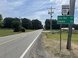 The route begins at I-40/US 63 in Hazen. Highway 11 runs north until forming a 3.0 miles (4.8 km) concurrency with Highway 38 east to Des Arc. Continuing north into White County, the route runs through Griffithville and Higginson before terminating at Highway 367 at the southern limits of Searcy.