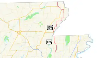Arkansas Highway 139 is a state highway of 44.7 miles (71.9 km) in Greene and Clay Counties.[2][3] The route lies close to the St. Francis River in low, flat ground dedicated largely to cotton growing where it isn't swampy.
