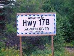 The Garden River portion of Highway 17B follows the original route of the Trans-Canada Highway within Algoma District into eastern Sault Ste. Marie. Negotiations for the construction of a four-lane bypass of Echo Bay began in the mid-1970s, though ultimately it would take until 1994 for the province to reach an agreement for land transfers with the Garden River First Nation.[2] Following completion of the expressway bypass in 2005, the province of Ontario redesignated the former portion of Highway 17 as Highway 638. The Garden River First Nation insisted on the designation of Highway 17B instead, even going so far as to post their own non-official Highway 17B signs on the route.[3]
