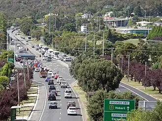 Highway 1 commences in the Hobart city centre as the Brooker Highway, and travels 17 km (11 mi) north on parallel trajectory to the River Derwent until it reaches Granton, where the Highway ends. From this point the Midland Highway becomes Route 1 and travels over the River Derwent and passes through the Brighton Bypass before continuing north towards Launceston.[1] A 3.8-kilometre (2.4 mi) long spur section of Highway 1 travels into the centre of Launceston, first as the continuation of the Midland Highway, and then as a Couplet – northbound on Bathurst Street, and southbound on Wellington Street.[2] South of Launceston, Highway 1 continues west as the Bass Highway to Deloraine, after which it travels north to Devonport, and then west along the northern coast to the route's terminus in Burnie. The Bass Highway, however, continues towards Marrawah on the state's west coast.[1]