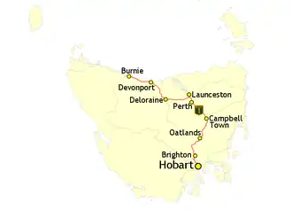 | Major settlements | Glenorchy, Brighton, Oatlands, Campbell Town, Perth, Launceston, Deloraine, Devonport, Ulverstone |