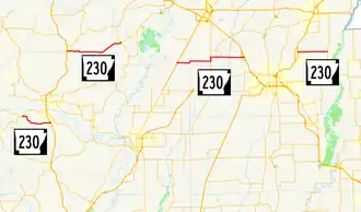Highway 230 was first authorized by the Arkansas State Highway Commission (ASHC) on July 10, 1957 between Cave City and Strawberry.[2][3] A second route was designated between Alicia and Bono on June 23, 1965,[4] with a third highway created between Brookland and Dixie on January 12, 1966.[5] The final section was created on April 26, 1978 when Highway 14 was rerouted onto Highway 25 toward Batesville. Highway 230 replaced the Highway 14 designation between Locust Grove and Southside.[6]
