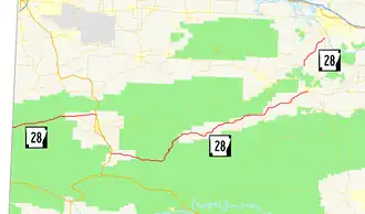 Highway 28 begins at the Oklahoma state line as a continuation of OK-128 and runs east, following an ecoregion boundary between the flat Arkansas River Valley and the Ouachita Mountains, as well as the Arkansas Southern Railroad tracks.[3] The route runs east as a two-lane road through the Ouachita National Forest in a sparsely populated segment of oak-hickory-pine forest. Highway 28 passes the historic Bates School, listed on the National Register of Historic Places.[4] The route continues east through Cauthron and Oliver before emerging from the Ouachita National Forest near Hon. In Hon, Highway 28 serves as the western terminus of Highway 80, before continuing east to US 71, where it terminates north of Waldron.[5]