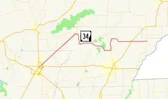 Arkansas Highway 34 (AR 34) is a designation for two state highways in the Upper Arkansas Delta. One segment of 27.22 miles (43.81 km) runs from US 412B in Walnut Ridge east to Highway 135 in Oak Grove Heights. A second segment of 12.96 miles (20.86 km) runs from Highway 135 in Lafe east to Highway 139 at Fritz. Both routes are maintained by the Arkansas State Highway and Transportation Department (AHTD).[2][3][4]