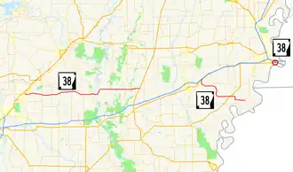 Arkansas Highway 38 (AR 38) is a designation for three state highways in Arkansas. One segment of 50.2 miles (80.8 km) runs from Interstate 57 (I-57) in Cabot east to U.S. Route 49 (US 49) south of Hunter.[2][3] A second segment of 21.47 miles (34.55 km) runs from I-40 north of Widener east to Highway 147 west of Horseshoe Lake.[4][5] A third segment of 0.8 miles (1.3 km) runs in West Memphis from US 70 north to I-40. All routes are maintained by the Arkansas State Highway and Transportation Department (AHTD).